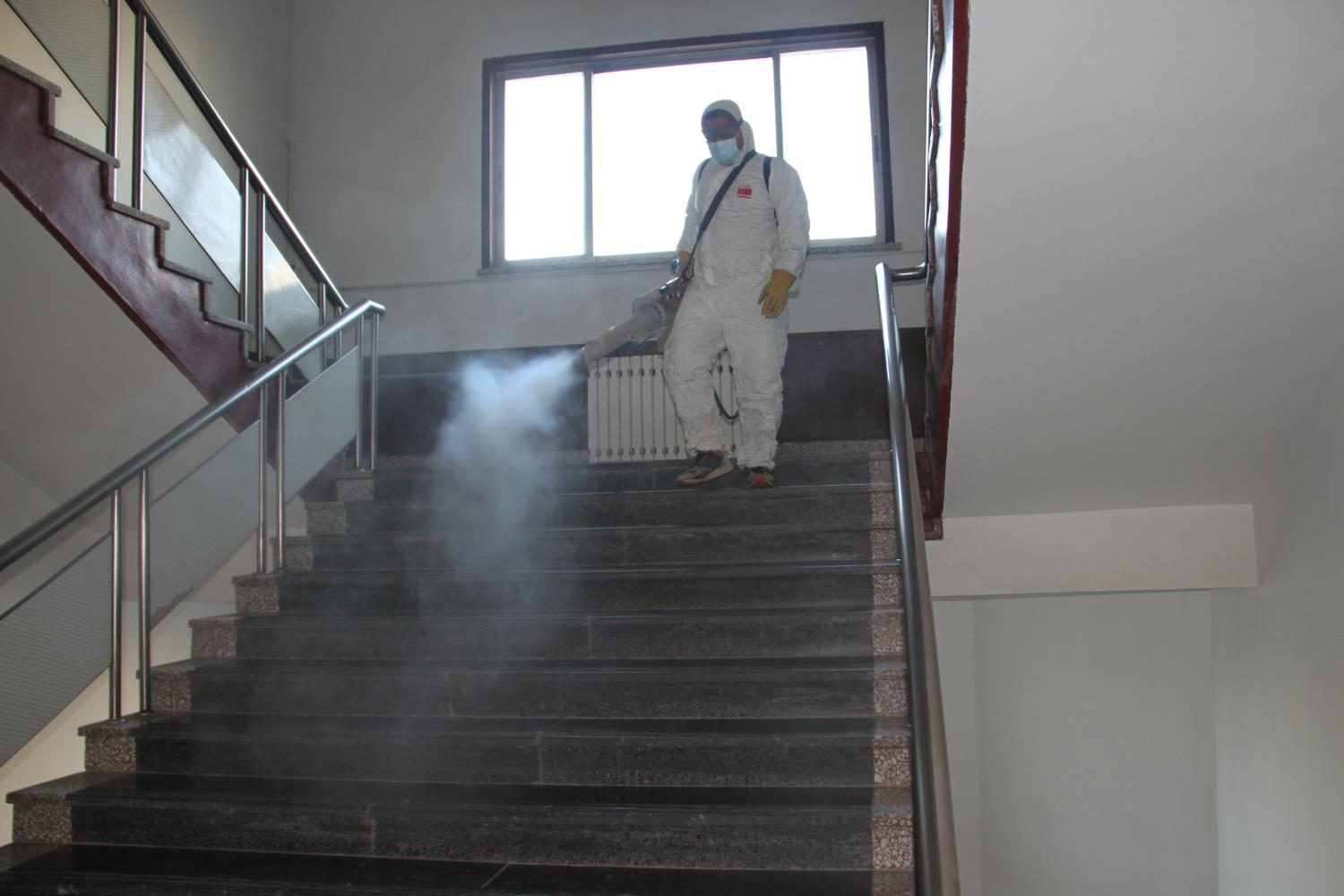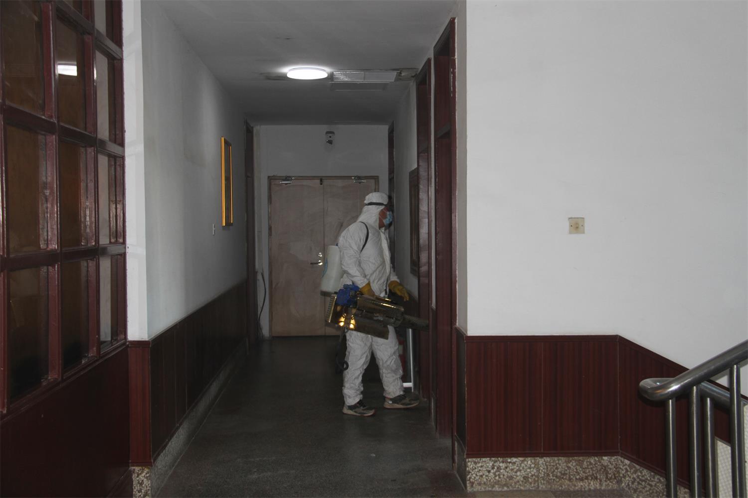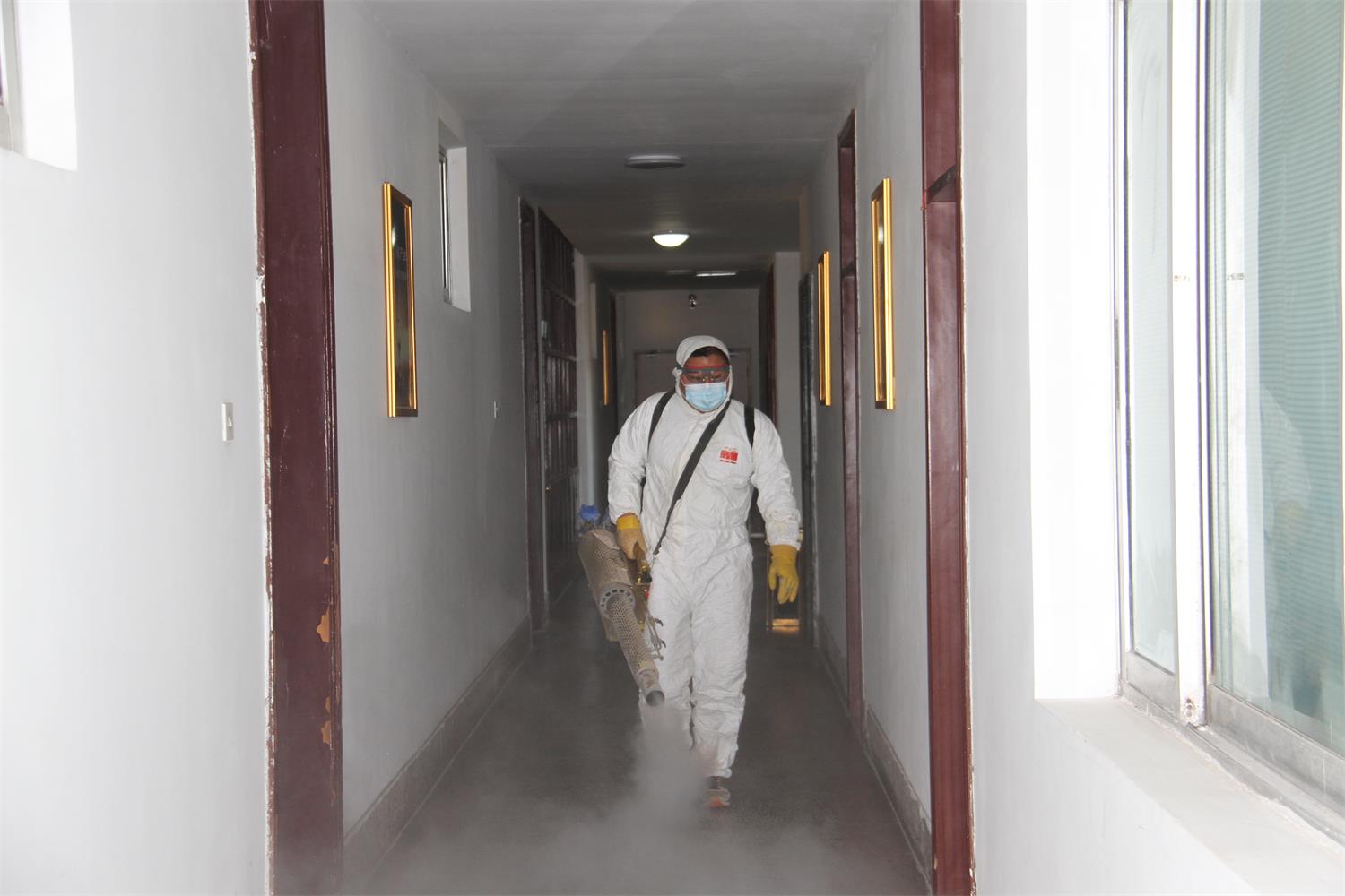 1月9日下午,集团职工王祥(齐河县蓝天救援队队员)使用专业设备对机关办公楼内的走廊、楼梯、卫生间等公共区域进行消毒。