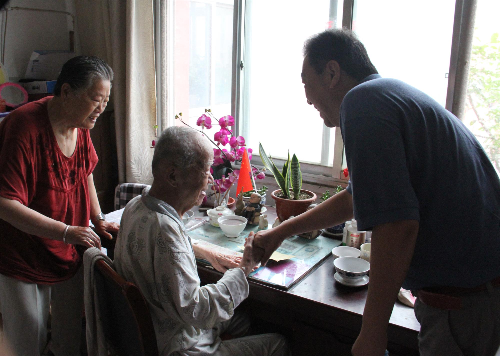 6月30日上午,在建党99周年即将到来之际,齐河县住建局局长汪志刚同志、党组副书记胡安军同志在旗舰集团总经理韩利同志的陪同下,专程来到建国前入党的老党员吴延良同志的家中走访慰问,向他致以节日的问候和美好的祝愿,将党组织的温暖和关怀送到老党员的心中。